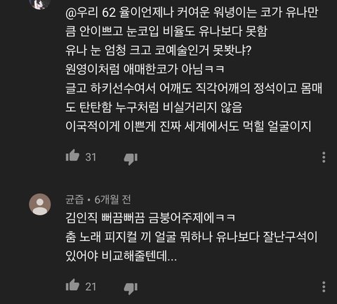 뭔 유나 직캠이나 글에서 피지컬이나 황금막내 얘기만 있으면 스위치 눌려서 갑분 장원영 언급하고 ㅋㅋㅋ 캡쳐 같은거 안해도 유나 글에 원영 언급댓 ㅈㄴ널리고 널림 ㅋㅋㅋㅋㅋㅋ 장원영팬들은 신경도 안쓰는데 ㅋㅋ 개어이없음