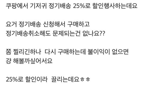 맘카페가 주로 뜨고 절약하는 카페가 뜨던데 정기배송 한달 하고 취소하는경우가 엄청 많더라구요