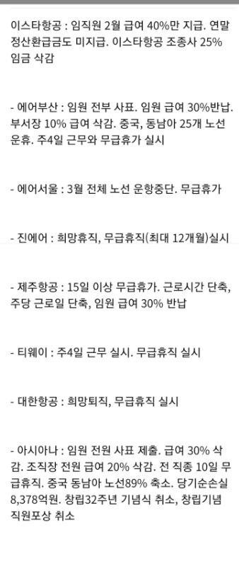 저가 항공사들은 일본하고 동남아로 돈버는데 일본 불매로 이미 타격이 큰 상태에서 코로나로 비행기도 못뜨니까 진짜 망하기 직전이고 아시아나랑 대한항공은 일본 불매때 힘들긴 해도 다른 나라 가니까 버틴건데 코로나로 난리난거임... 평소에 아시아나는 몇번 나가는지 모르고 대한항공은 LA로 하루에 두번 나갔는데 이제 대한항공만 하루에 한번 나간다고 들음... 심지어 승객 5명 타고 왔대...