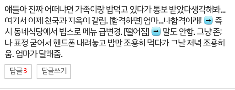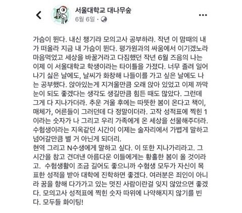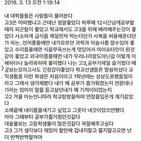 그리고 가끔 의욕 떨어질 때는 서울대 합격한 나 생각함 진짜 행복하지 않니...? 부모님한테도 자랑이 되는 딸 되고 학교에서도 쟤 서울대 붙었대 수군 거릴 거고 나 싫어하는 애는 나 보면서 배아파하고 ㅎㅎ 이런 거 생각하면 좋지 않니 막 열심히 해야될것같고 ㅋㅋㅋㅋ