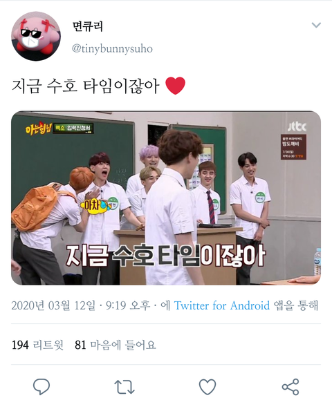 백현이 솔로라고 해주니까 (이번이 첫 스포도 아님 작년 연말부터 솔로콘서트도 한다고 꾸준히 스포) 수호 예판 기간인데 솔로 홍보를 왜 하녜 ㅋㅋ 웃긴건 세훈 찬열이 인스타 라이브 켜서 여름에 앨범 낸다고 스포할 땐 이렇게 안 팸 걔네도 수호 솔로 나온다고 피셜 뜨고 스포함 오늘 녹음한다고 앨범이 당장 나오는 것도 아니고 최소 2달은 기다려야 하는데 수호 앨범 팬들이 덜 사면 니 탓이다 여우ㅅㄲ다 별 말을 다 함 정작 백현 팬들은 작년 첫 솔로 때 세찬 유닛이랑 겹쳐서 예판 기간에 유닛 떡밥 떠도 아무 말 안했는데