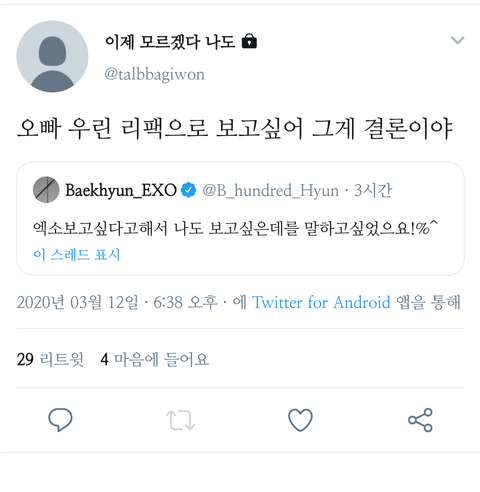 오늘 실트에 보고파 엑소가 떠서 백현이 자기도 보고싶다고 해주고 녹음하고 있다고 스포해줬더니 리팩이여야 된다고 슈퍼엠이면 오지도 말라고 궁예질하면서 팸