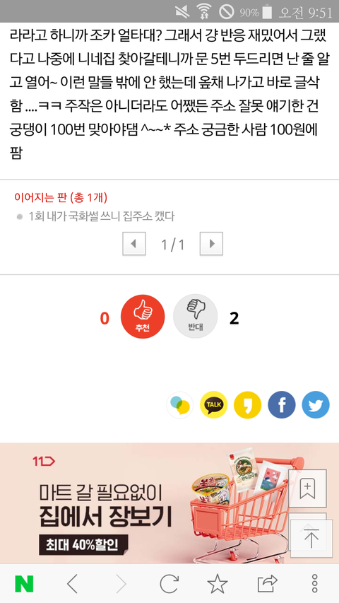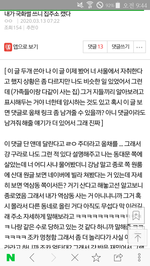 어제 댓글로 계속 자기도 그런 일 있었는데 너무 걱정된다고 옾챗할 수 있냐고 하던 애랑 쓰니랑 옾챗했는데 쓰니가 무서워서 판에 주소 바꿔서 올린거랑 쓰니네 진짜 집주소 알아내서 걔가 태세전환해서 주소 뿌리겠다고 협박해서 글쓰니가 글 삭제한거임