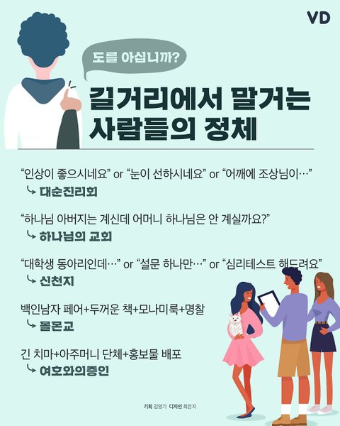 그리고 시간이 흘러 2월이 되었습니다. 여러분 모두가 아시다시피 코로나 19가 유행하게 되었고 덩달아 신천지가 떠오르게 됩니다. 신천지가 유행하게 됨에 따라 '신천지 위치 알림' 애플리케이션도 나오게 됩니다. 어느 날 저는 '우리 집 근처에는 신천지 장소가 있을까?' 하는 궁금증이 들었습니다. 그래서 애플리케이션을 설치했고, 집 근처에 신천지 센터가 하나 있음을 확인했습니다. '어휴, 우리 동네에도 있었네' 하고 애플리케이션을 껐는데, 문득 저에게 하나의 인터넷 사진이 생각났습니다. 처음 이 그림을 봤을 때는 다양한 이단, 사이비들이 다양한 방법으로 접근하는구나 하고 넘겼었습니다. 그런데 갑자기 저 사진이 떠오르면서 신천지의 심리 상담 테스트가 눈에 들어오는 것입니다. 그래서 저는 제 강연장을 지도 애플리케이션으로 주소를 알아내고, 이 주소를 신천지 위치 알림 애플리케이션으로 검색해보았습니다. 그리고 그 결과 저는 강연장이 신천지 센터임을 알게 되었습니다. 맨 처음 신천지임을 알게 된 순간 저는 온몸에 소름이 돋았습니다. ‘내가 그렇게 혐오하던 사이비 종교에 빠질 뻔했구나, 이러한 코로나바이러스에 감염될 수도 있었겠구나’ 하는 마음에 약간의 무서운 느낌도 들었습니다. 진짜 ‘정말 운 좋게 빠져나올 수 있었구나’ 하는 안도를 할 수도 있었습니다.