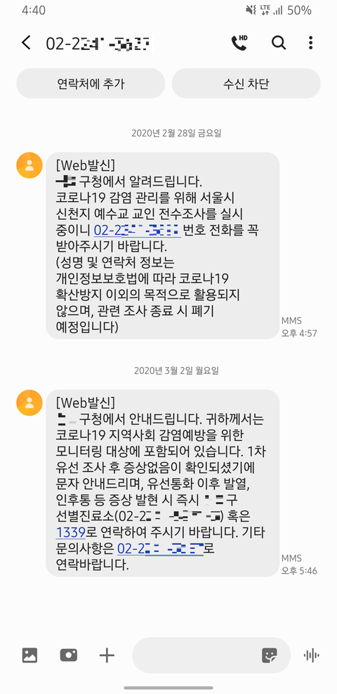 그렇게 저는 제가 신천지에 들어갈 뻔했었다는 건 알았지만, ‘설마 내가 신천지겠어.’ 하는 마음도 있었습니다. 심리상담사라고 접근했던 사람과 여러 번 만나긴 했지만, 실제 내용은 강연 2주 분량밖에 듣지 않았고 금방 빠져나왔기에 설마 하는 마음이었습니다. 또한, 당시 신천지 알림 앱은 다른 사람들의 제보를 통해 제작되어 그 정확도가 완전하진 않았습니다. 그러나 며칠 후, 신천지 쪽에서 공식적으로 자신의 교회, 센터 위치를 1100군데 공개하였고, 확인해본 결과 공식적으로 그 강연장은 신천지 시설이 맞았습니다. 이 사실을 알자 저는 제가 그 센터에 있었지만 얼마 참석 안 했으니 신천지 신도는 아닐 것이라 믿고 싶었습니다. 하지만 며칠이 지난 후 저는 하나의 문자를 받게 됩니다. 처음 문자를 받고 불안한 마음에 지인들에게도 이 문자를 받았는지 물어봤습니다. 그리고 한 명이 본인도 같은 문자를 받았다고 하여, 안심하고 통화를 했습니다. 제가 거주하던 담당구청 상담원과의 통화로 중국 지역 방문 여부, 대구 지역 방문 여부, 발열이나 호흡기 증상 유무 등을 물어보았고 모두 해당하지 않는다고 대답했습니다. 하지만 며칠이 지난 후, 저는 하나의 문자를 더 받게 됩니다. 도저히 찝찝했던 저는 그 지인에게 다시 한번 더 물어봤고, 지인이 자신이 문자를 잘못 봤다며, 본인에게는 이러한 문자가 오지 않았다고 했습니다. 저는 혹시 하는 마음에 그 상담원과 한 번 더 통화하여 혹시 제가 신천지와 연관 있다고 나와 있는지 물어보았습니다. 그러자 상담원이 제가 신천지 교육생 리스트에 있어서 연락드린 게 맞는다고 말해주었습니다. 저는 저에게 있었던 일을 모두 설명해주었고, 지금은 신천지 쪽 사람하고 아무 연관이 없다. 이 일은 잊고 싶다. 내가 신천지와 연관이 있었음은 맞지만 지금 제가 저기 리스트에 있다는 건 솔직히 기분 더럽고 불쾌하긴 하다고 정중하게 말했습니다. 그러자 상담원은 그럼 앞으로는 연락 안 하겠다고 말해주었습니다.