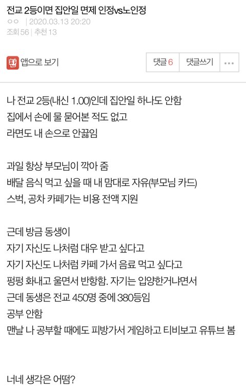 추)전교 2등이면 대우 해주는게 당연;; 동생년도 꼬우면 공부하라고 하셈.