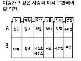 여행스타일기본적으로 잘맞아야돼고 서로 매너있어야돼 여행가면서 서로 예민해질때도 있잖아? 양보하면서 말도예쁘게하고 그럼 싸울일없음