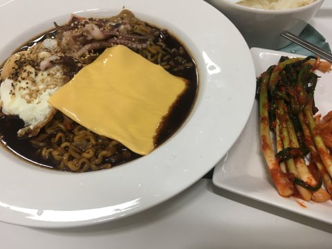 갑자기 짜장라면이 먹고싶어서 오ㄸㄱ 짜장라면과 치즈 계란후라이 그리고 냉동실에 있는오징어 까지 해서 짜+치+계+오 해먹었어요 ㅋㅋㅋ 엄마의 파김치까지 해서 완전 꿀맛이었습니다 .