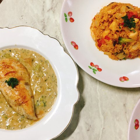 크림 닭가슴살 스테이크랑 볶음밥! 닭가슴살이 촉촉해서 맛있어요