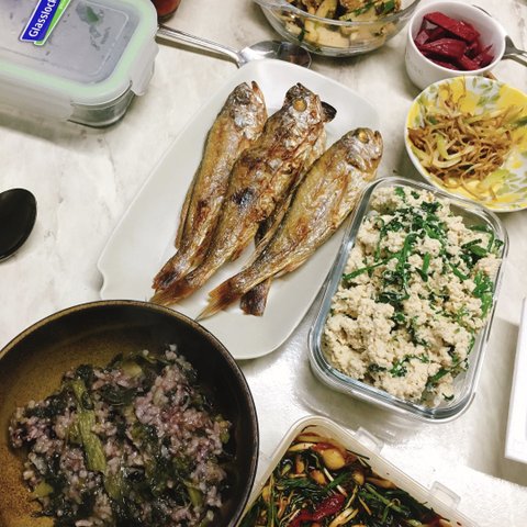 조기 굽고 시금치두부무침! 무청시래기밥 처음 해봤는데 너무 질어서 슬펐어요 ... ㅜㅜㅜㅜㅜ 달래가 싸서 달래장두 ㅎㅎ 홍고추 썰어넣으니까 넘 맛있어요ㅜ