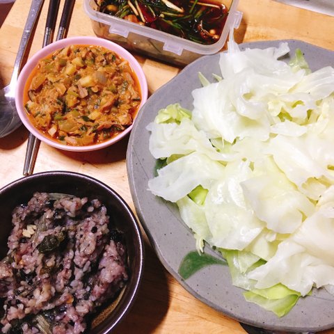 양배추찜이에용 시래기밥이랑 참치쌈장해먹깅ㅎㅎ 달래장두 같이.