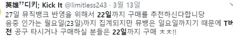 또 20일 다되서 서버 터뜨리지 말고 무조건 지금부터 빨리 사야함 ㅠㅠ ㅅㅂ 슴 제발 금요일 발매좀 그만해줬으면 좋겠다 외국 노리는거겠지만 ㅠㅠㅠㅠㅠ