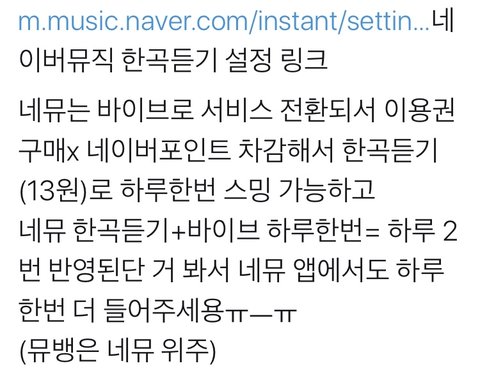 네이버뮤직 1회 듣기=바이브 1회래 네이버 포인트로 13원에 가능 하루에 한번씩 듣고 바이브 들으면 두배 가능이네!! +설정 링크 댓글로 달게