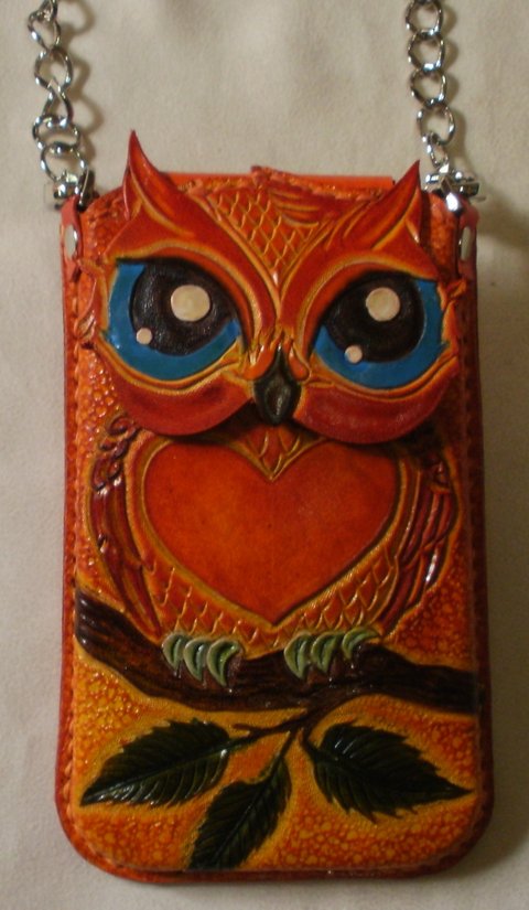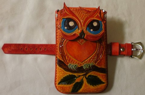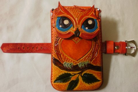가죽에 부엉이 디자인을 카빙하고 천연염색하여 수작업으로 제작한 핸드메이드 팔찌,벨트,숄더 겸용 폰케이스입니다.(마디샤)
