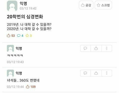 과목 전부 싸강한단말여 근데 어떤건 방통대로하고 어떤곤 유튜브 어떤건 학교홈페이지 어떤건 학교클라우드? 네이버밴드 등등 ㅅㅂ 개복잡해 과제도많고 힘들어죽겠음