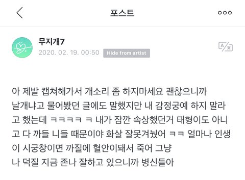 니네 저분 생각해주는척하지마 역겨우니깐ㅋㅋㅋ 김태형까고 싶어서 이용해먹는거면서 당사자 더기분나쁘고 곤란해지게 하지말라고