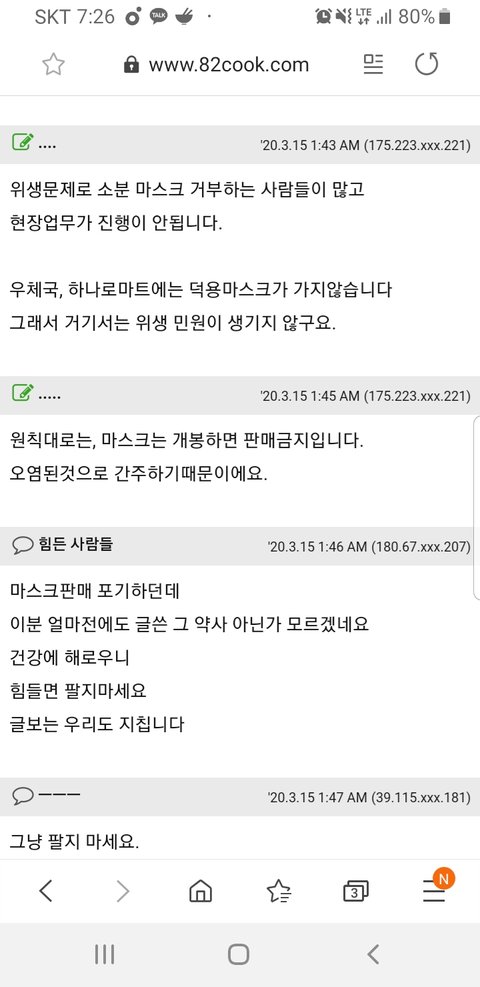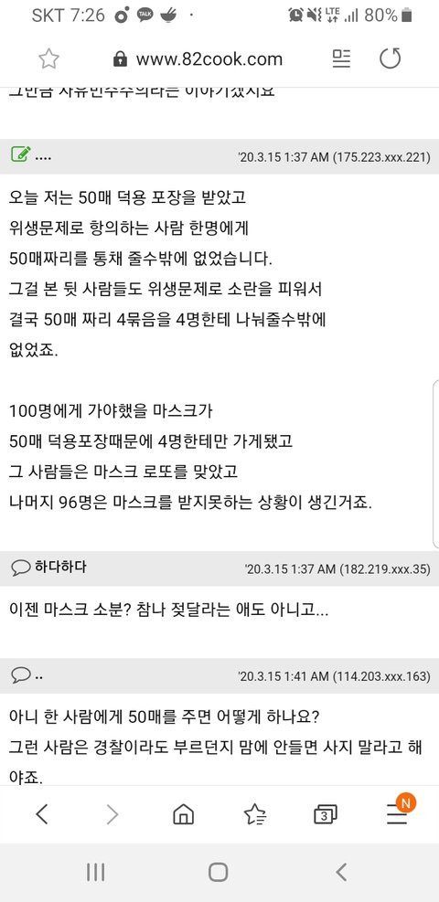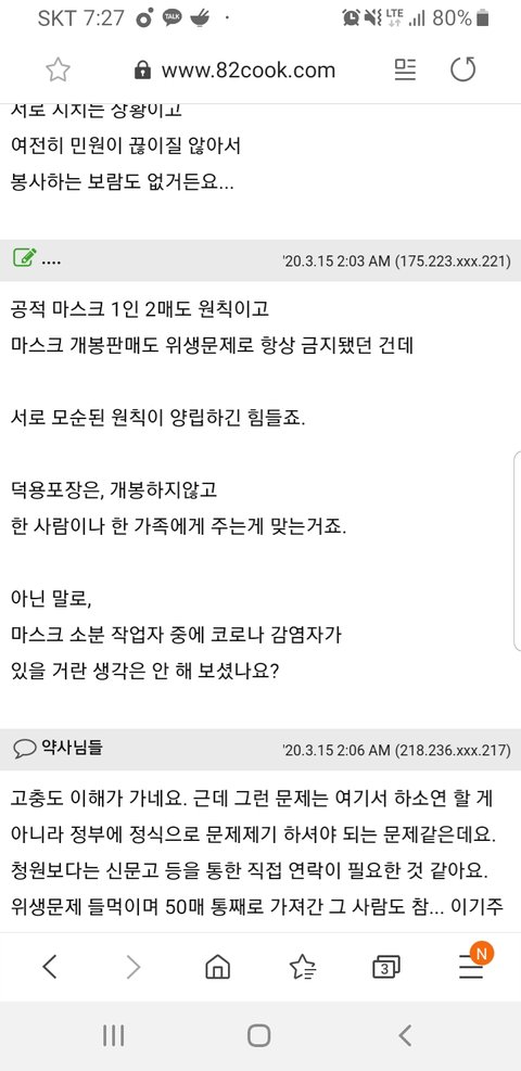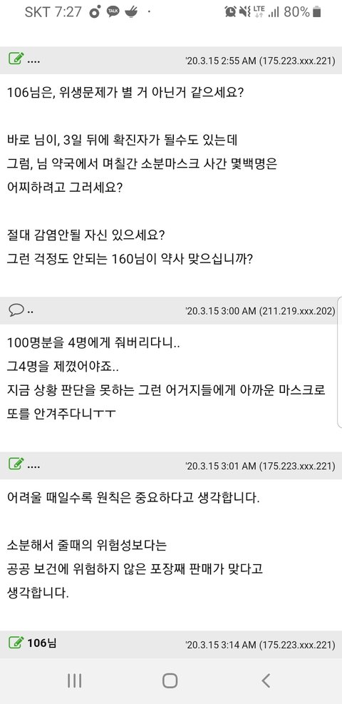 마스크가 벌크포장으로 50매 4묶음이 왔는데 소분 판매하면 위생상 안좋으니 4명한테만 50장씩을 팔고 끝났대요. 1인당 2장씩 아니에요? 이게 가능한 일인가요? 약사님들 의견 궁금합니다