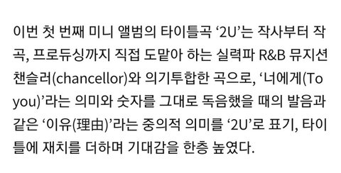 타이틀곡 2U는 너에게(To you)라는 의미와 숫자를 그대로 독음 했을 때의 발음과 같은 ‘이유(理由)’라는 중의적 의미래 두가지다 맞음ㅋㅋㅋㅋㅋ