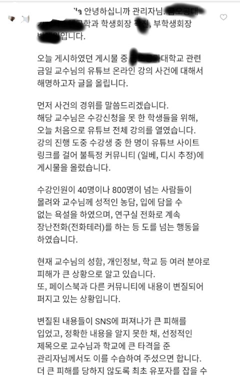 요약 - 교수님이 수강신청 못한 사람 위해 유튜브로 실시간 강의 진행함. 교수님이 졸린 학생들위해 유행가 노래한곡 틀어준다했다가 실수로 걸그룹 직캠 재생목록이 추가된 건데 누가 그거 퍼트려서 내용 왜곡됨. 교수님이랑 학교 신상 털려서 조롱당하는 중