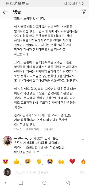 저 댓글 학교 회장이 복붙해서 올라온 커뮤에 계속 댓글 남기는 중인데 아무도 게시물 내리는 사람이 없음;;;;; 진짜 너무하지않냐