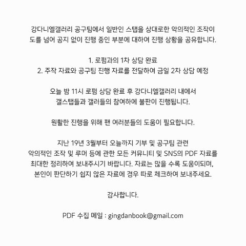 PDF 수집 메일 : gingdanbook@gmail.com 혹시 스탭들 상대로 악의적인 루머뿌리는거 보면 피뎁따서 보내주면 좋을거같아ㅇㅇ