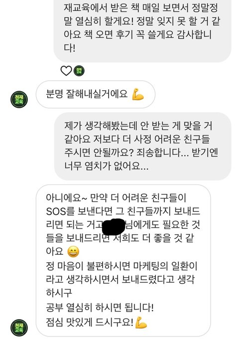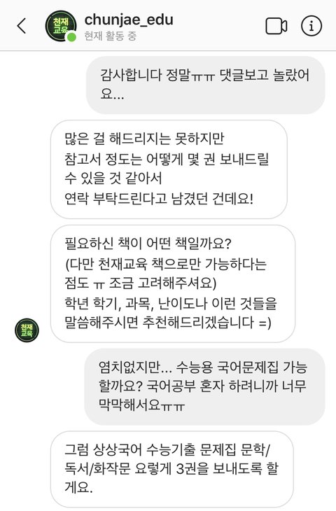 톡선 갈지도 모르고 쓴 글이 톡선이 가서 많은 사람들이 관심을 줬었어 그 중에 나에 대해 안 좋게 말하는 댓글들도 있어서 책 안 받겠다는 이어쓰기 글까지 올리고 댓글은 안 보려 그러다 한번 봤는데 천재교육에서 디엠 달라고, 문제집 주신다는 댓글을 보고 연락 안 드리려다 다들 이거라도 받았으면 좋겠다하길래 염치 없이 연락 드렸었어