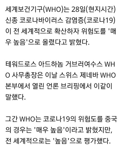 [속보] WHO, 코로나19 전세계 위험도 '매우 높음'으로 상향