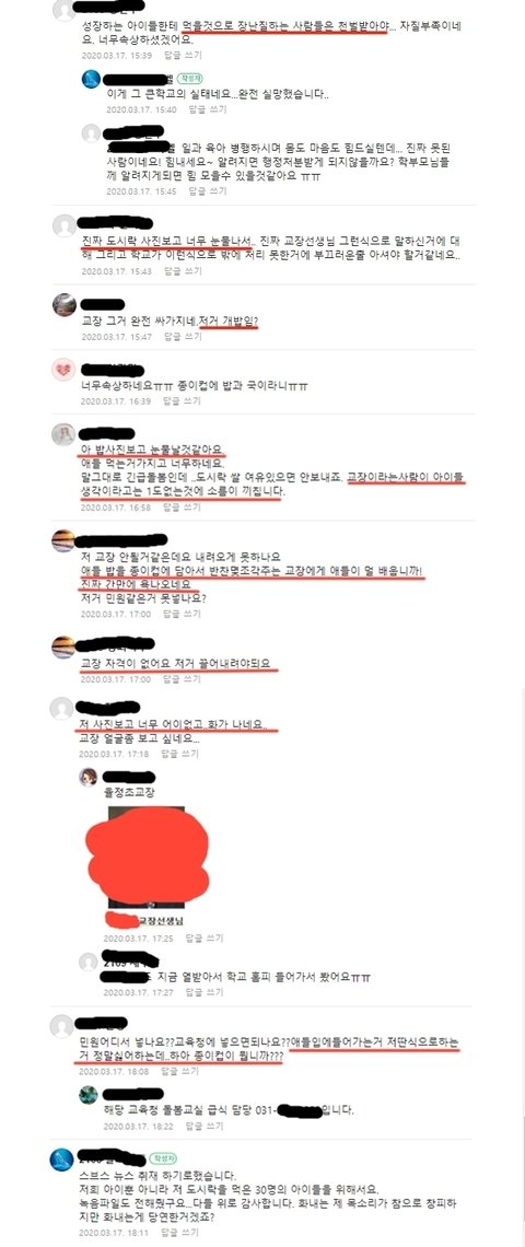 맘카페 가면 애 낳으면서 개념은 미역국 먹을때 같이 말아 먹었는지 개념 없는 엄마들 널리고 널림. 앞 뒤 다 자르고 결론만 가지고 얼마나 지랄들인지 그렇게 걱정되면 도시락을 싸서 보내든가 아~ 자기는 일하는 사람이라 도시락 쌀 시간이 없다고 하려나 핑계거리 좋죠? 아니면 식기를 사서 보내든가. 지금 코로나 때문에 위생 문제도 심각해서 일회용으로 쓴거 같은데 공용으로 남이 쓴거 돌려쓰는거 보다 난거 아님? 그렇게 걱정되면 자기 손으로 도시락을 싸서 보내든가