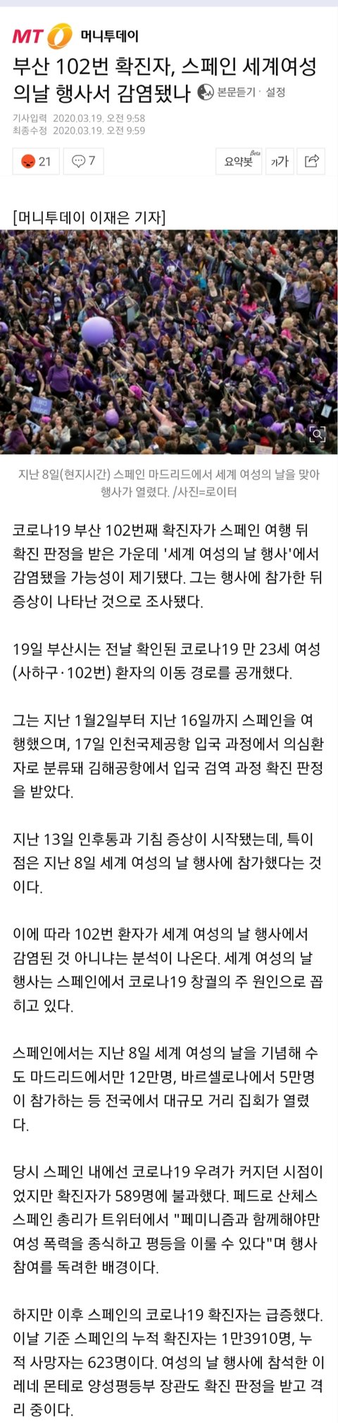 부산 코로나 확진녀 스페인 여성의날 시위 참가함.