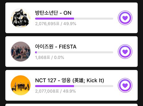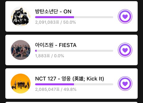30초 단위로 몇천표씩 늘어서 분명 3분전에는 꽤 많이 차이났는데 갑자기 지금되니까 엄청 확 좁혀졌어!!!내일까지야 ㅠㅠㅠㅠ저거 10%반영이라고 음중 ㅠㅠㅠㅠㅠ제발 ㅠㅠㅠ제발