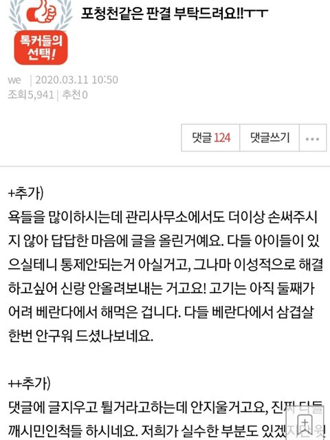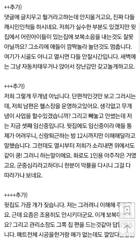 지금까지 긴글 읽어주셔서 감사드리고요, 하고싶은 말은 많지만 A도 볼것같으니 아껴두렵니다. 그동안 집은 하루 24시간 중 한시간도 못쉬는 곳이됐고 저희도 이제는 참지 않으려해요. 작게는 보복소음부터 크게는 법적 처벌까지 불사하렵니다. 이건 사람이 사는게 아니예요.ㅠㅠ (돌아가신 부모님이 물려주신 집이라 팔고 이사가고 싶지는 않아요.) 혹 또다시 A가 글을쓰더라도 제 입장도 이해해 주셨으면 좋겠어요. 코로나 때문에 정신 없으실텐데 속터지는 글 읽어주셔서 감사드려요.