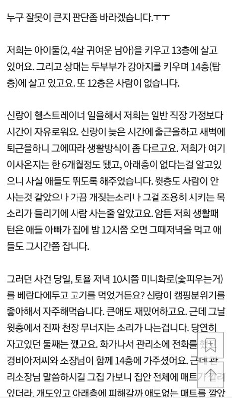 안녕하세요. 네이트 판이 처음인지라 게시글 작성법이나 사용법이 서툴러도 이해부탁드려요. 일단 오늘에서야 이 내용을 봤어요. 인스타에서 유머글같은걸 올리는 계정이 있는데 그거 구경하다 이 글을 발견했어요. 근데 시기상이나 내용면에서 아무래도 저희집 이야기인것 같아서요. 익명으로 쓴 글이니 굳이 이렇게까지 할필요 없다고 생각하시겠지만 너무 억울하고 답답해요.ㅠ 이제부터는 아랫층 어머님을 'A'라고 하겠습니다. 글을보니 A도 저를 존중하지 않으셨더라고요. 첨부된 사진은 인스타에서 찍은 스샷 중 일부예요.