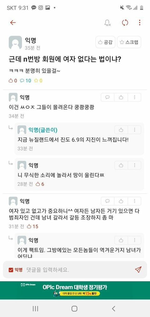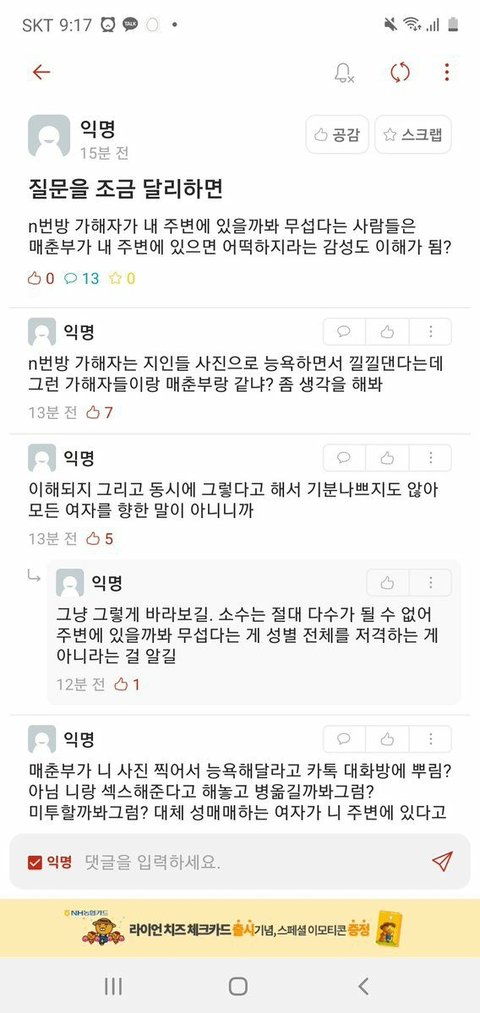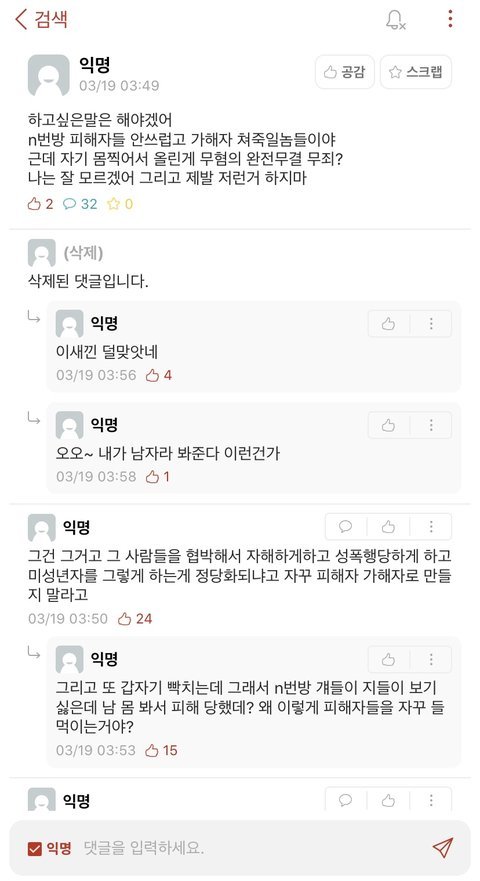 성별떠나서 정상적인 사람이라면 n번방 당연히 욕하고 처벌 바라야지..미자 상대로 강간.협박.공유...더럽고 역겹다..인간이길 포기한 머저리들이다. 누가 야동 보지 말랬냐? 단지 불법적인 걸 보지말라 한거지..정상적인 말을 하는데도 남혐이다. 쿵쾅이다.이런 반박은 애초에 기본이 혐오로 가득찬 인간이라 비판 당할 자격 조차 그냥 되먹어 있지가 않음..인간을 포기하면 됩니다 다음생엔 부디 정상적으로 태어나시길..