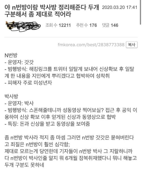 악랄하다던 일명 박사방은 "스폰을 해 줄테니 음란물을 찍지 않겠냐" 라며 접근 후 공익 이용하여 얻게 된 신상정보와 영상을 유포하겠다고 협박을 하는것이 박사방 운영자의 수법이었다.