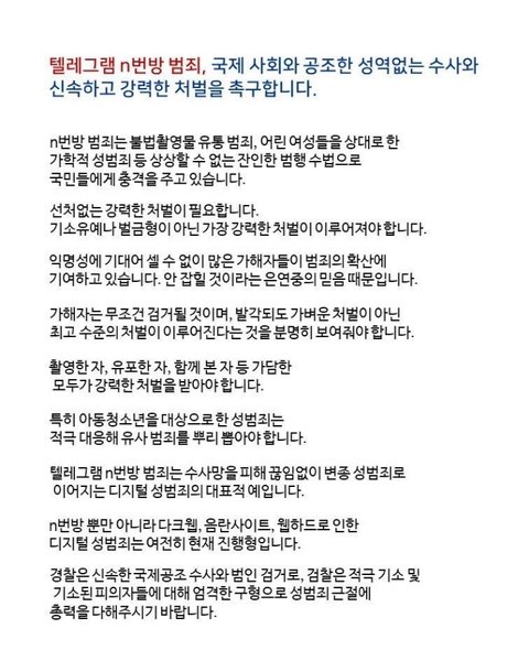 텔레그램 n번방 가입자 전원의 신상공개를 원합니다