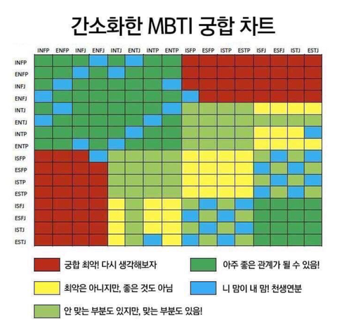 성격 궁합 차트 나랑 내 남친 하늘색인데 각자의 단점이 상대방에 의해 보완 되는 것 같아 친구들이 그 날 컨디션에 따라 성격 유형이 달라진다길래 재미로 하는 건 줄 알았는데 어느정도 일리가 있는 것 같아