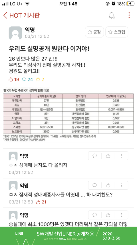 아닠ㅋㅋㅋㅋㅋㅋ진짜 빡대가린가? 성매매 종사자가 27만이다? 그럼 성구매남들은 그 수백배라는 소린데 왜 자기 무덤 파는 소리를 해???ㅋㅋㅋㅋㅋㅋ 성매매종사자 싹다 신상까기 졸라 찬성이요~~~~~ 당연히 구매자 포함~~~~~~~~