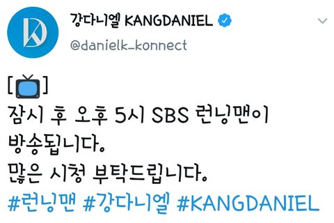 https://twitter.com/danielk_konnect/status/1241630815634653184 강다니엘 런닝맨 본방사수⭐
