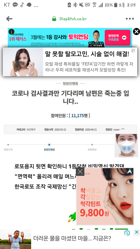 코로나 때문에 치료못받고 있데 청원해주자ㅜ 청원링크 https://www1.president.go.kr/petitions/586923#_=_