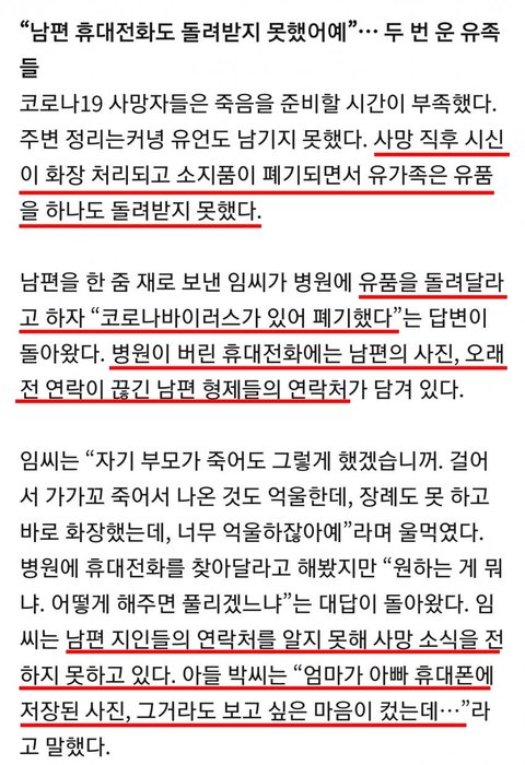 시신도 다 화장해버리고 핸드폰까지 전부 폐기해버려서 순식간에 얼굴도 못보고 생이별인데다가 폰에 사진도 다 없어지고 저장된 연락처로 연락조차 못돌려서 장례도 제대로 못치루게됨.