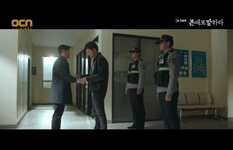 이에 박차장은 모든걸 체념 했다는듯이 일어서서 순순히 체포에 의하고 손목에 수갑이 채워 진다.