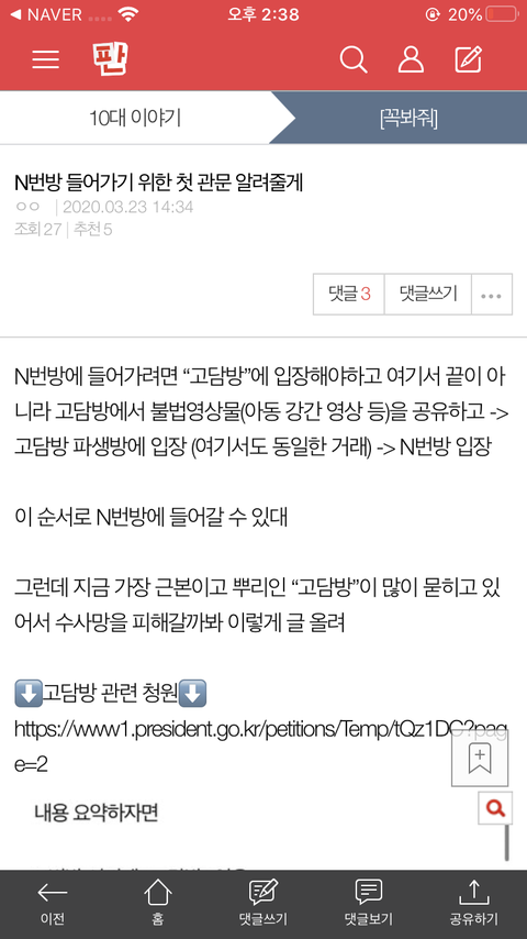 N번방의 근원인 고담방이 묻혀가고 있대 다같이 청원 한 번씩 꼭 하자!! 그리고 많은 판녀들이 볼 수 있게 저 글 톡선 보내자