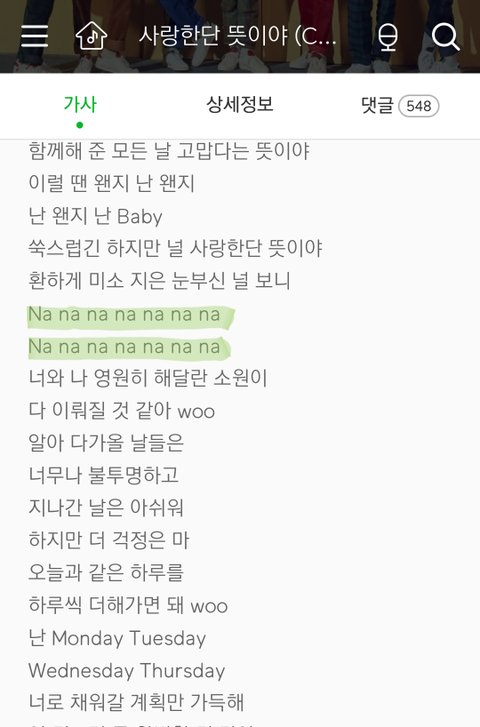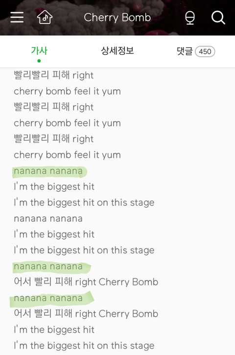 3. 한글로 "나나나"이든 영어로 "nanana"이든 나나나가 5번 이상 최소 한 줄이라도 있어야 함(그래서 1곡 제외함)
