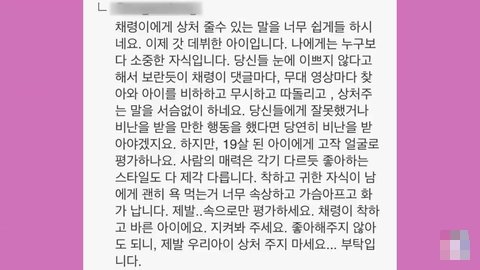 그리고 확실히 하나 해두자. 싫어할 수 있어. 그건 니들 개취고 사람 성향 차이니까. 근데 채령이 어머님 말마따나 싫다는 이유로 인신공격하고 속사정도 모르면서 나불대는거 그건 악플인거야. 너넨 실제로 채령이도 모르고, 유나도 모르잖아. 그저 보이는것만으로 채령이 인성 운운하려면 채령이가 유나 챙겨주고 칭찬해주고 같이 울어주는 영상 몇백분짜리도 같이 가져와야지. 그깟 1분 남짓한 영상으로 애 인성 운운하고 탈퇴하라는 말까지 하는 니들이 그동안 수많은 연예인들 세치 혀로 죽인거야. 인류애 떨어진다 진짜