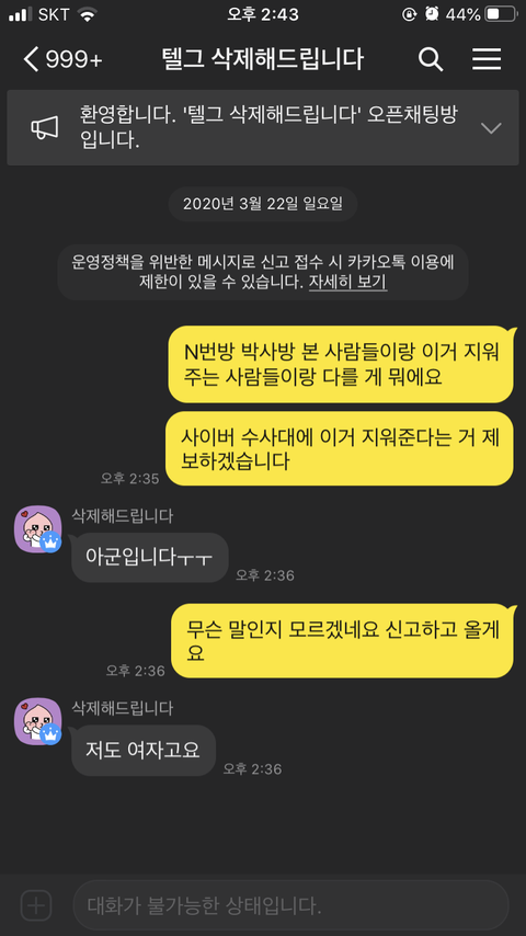 N번방 가입한 남자들을 낚아서 개인정보 털어보려고 노력하는 중. 이런 옵챗방이 수백개가 넘음. 저런 옵챗방을 개설한 사람들이 대부분 여자중학생,고등학생들인 걸 이미 파악한 남성들이 "왜 남자들의 개인정보를 지워준다고 하냐, 너같은 파렴치한은 당장 고소하겠다, 니가 진짜 여자라는 걸 어떻게 믿냐"라고 역협박해서 오히려 방을 개설한 여성의 개인정보와 사진을 받아내는 일까지 생기는 중