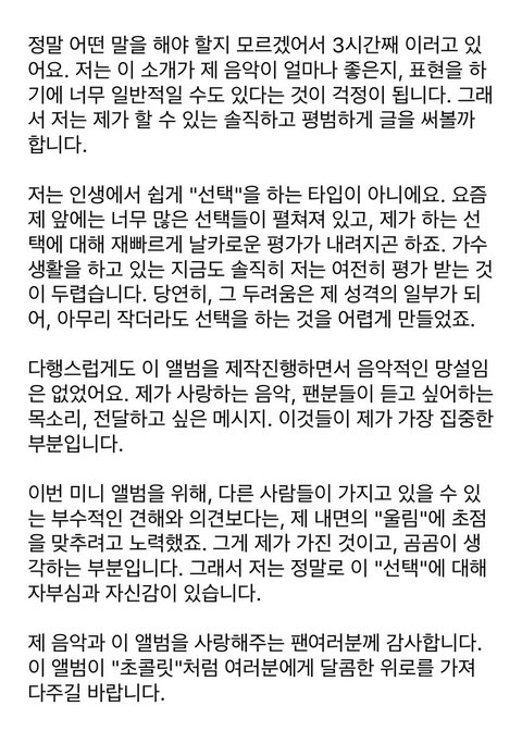 소개들 보니까 팬들에 대한 고마움과 애정이 너무 잘 느껴지고이번 앨범 준비하면서 정말 많이 고민하고 생각하고 노력했는지 잘 알 것 같아서그리고 그만큼 자신감도 보여서 눈물 찔끔한 사람 ㄴㅏ야나ㅠㅠ