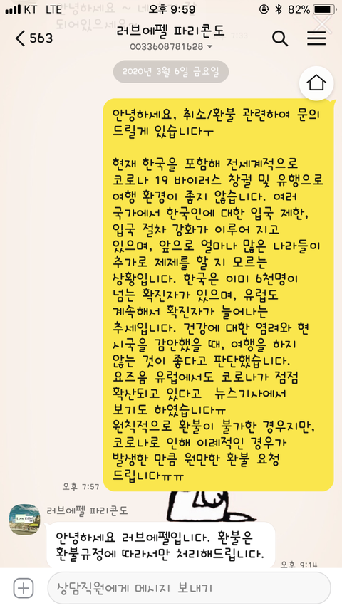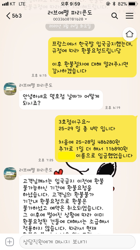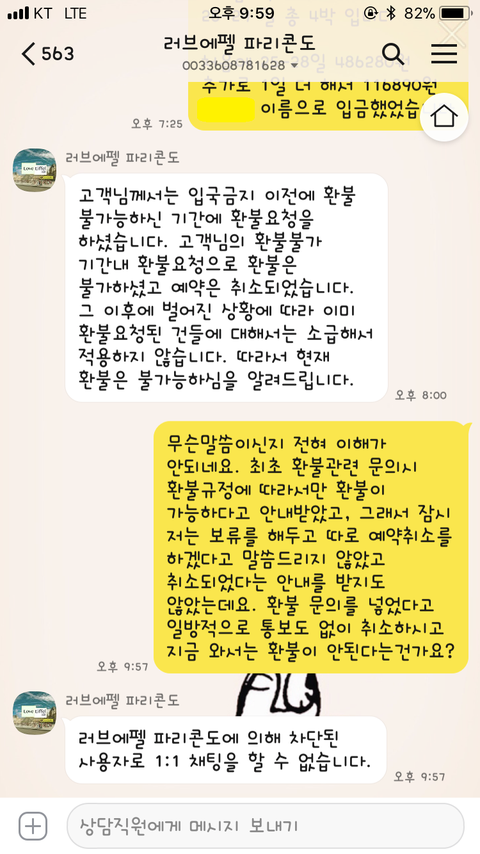 그후에 3월 17일 이후로 프랑스에서 한국발 입국금지 조치가 내려지면서 다시 환불을 위해 문의를 했습니다. 그랬더니 이미 환불 불가 시점에 환불요청으로 예약취소가 되어 환불이 불가능하다고 답변이 왔습니다. 저는 당시 환불이 안된다는 내용만 받았지 취소에 관한 아무런 내용 고지를 받지 못하였고, 취소를 해달라고 한적도 없었습니다. 그래서 다시 이야기하려 했더니 카카오톡 차단을 해놓았더라구요.