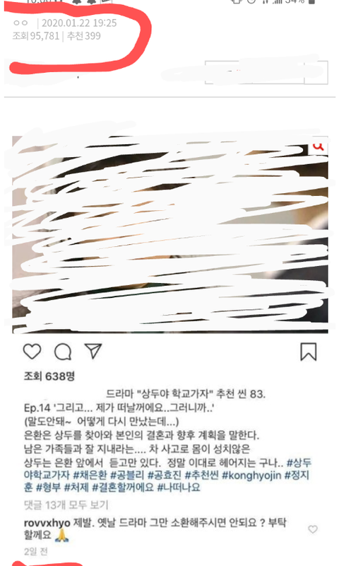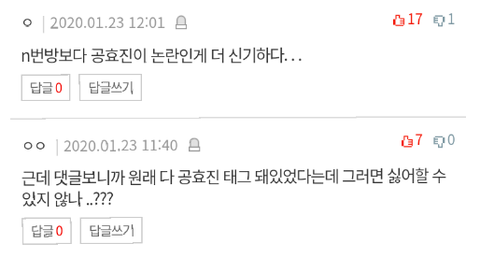 (캡처 당시 조회수가 낮았고, 기사 보도 몇일 전 공효진이 글을 쓴것을 미리 알고 캡처해둔 다음 큰 일이 아닌 것을 논란거리가 되게끔 기사를 써서 우한봉쇄일에 집중보도한것으로 추측됨)