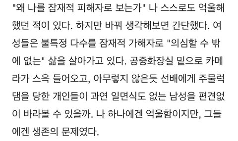 그리고 여자들은 ‘남자들은 잠재적 가해자이다’를 자기 보호 목적으로만 써라 자신을 지키기 위한 목적으로 써야 함 남혐 목적으로 쓰지 말고... 그리고 이건 자신의 권리가 아님을 인지했으면 좋겠음