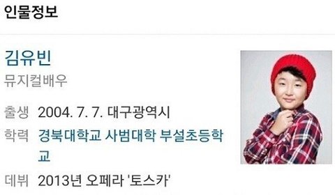 2004년생인 김유빈은 지난 2013년 오페라 '토스카'로 데뷔했다. 2014년 EBS 1TV 어린이 프로그램 '먹보공룡 티노'에 출연, 2015년에는 뮤지컬 '사운드 오브 뮤직'에 출연했다.